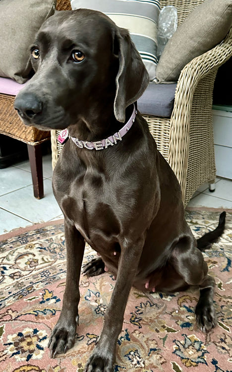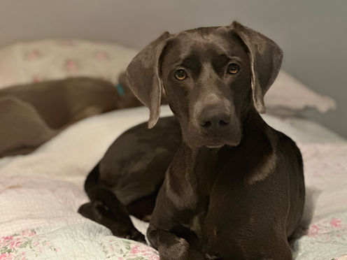 Zu unserer Familie gehört eine wunderschöne blaue Weimaraner Hündin, mit mittellangem Haar.